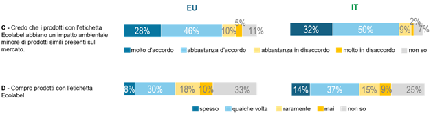Inoltre, la maggior parte degli intervistati dimostra fiducia nelle etichette ambientali: il 75% degli europei e l’82% degli italiani credono che i prodotti con l’etichetta Ecolabel abbiano davvero un impatto ambientale minore di prodotti simili sul mercato, ma soltanto il 38% degli europei e il 51% degli italiani dichiara di comprarli spesso o qualche volta.