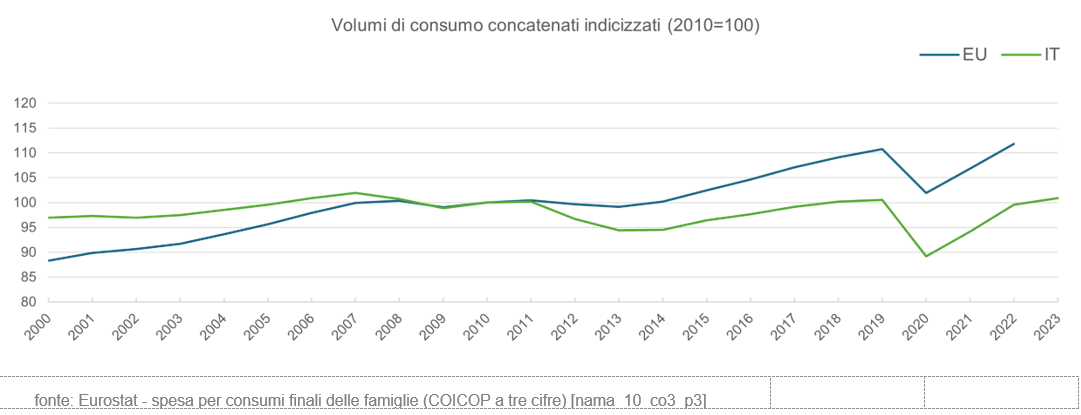 Dunque, anche le imprese, e di conseguenza il marketing, ci dice ancora il professor Mazzara ‘’devono raggiungere questa consapevolezza, altrimenti l’economia circolare rischia di essere soltanto un alibi, in odore di greenwashing, se non si affronta con decisione il nodo di una riduzione dei volumi di consumo”. Cosa che purtroppo non sta avvenendo. Secondo i dati Eurostat, infatti, dal 2000 i volumi di consumo sia degli Europei che degli italiani sono costantemente aumentati e, dopo il netto calo del 2020 a causa del covid, sono tornati a crescere.