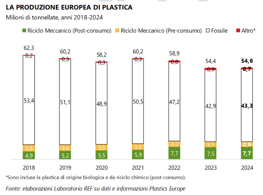 Per capire la portata della crisi occorre partire dai dati. Tra il 2018 e il 2024, la produzione complessiva di plastiche in Europa è in contrazione del 12%, da 62,3 milioni di tonnellate a 54,6 milioni di tonnellate, nonostante le plastiche derivanti da riciclo meccanico post-consumo aumentino del 57,1%. Nel medesimo periodo (2018-2024), la produzione totale di plastica mondiale fa segnare un andamento opposto, in crescita del 16%.