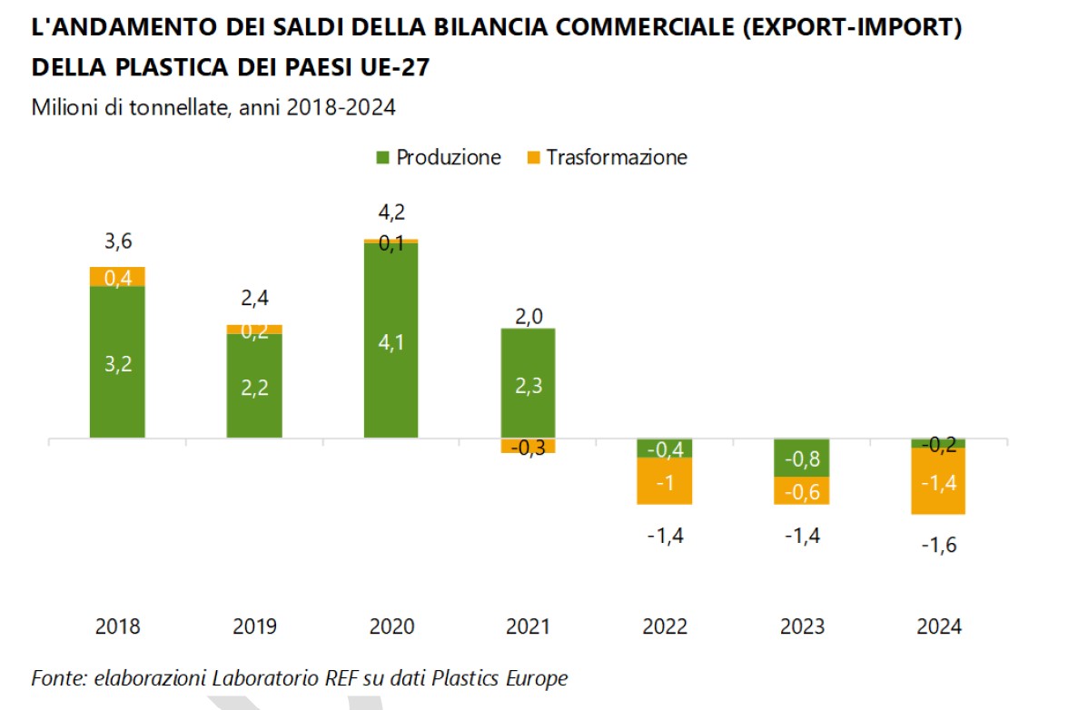 Sul fronte della bilancia commerciale, i dati sono preoccupanti: l’UE-27 registra nel 2024 un saldo negativo di 1,6 milioni di tonnellate, in esito ad uno sbilancio di 200mila tonnellate nella produzione e di 1,4 milioni di tonnellate nella trasformazione delle plastiche. Dal 2022, le importazioni extra-europee eccedono costantemente le esportazioni in volumi.