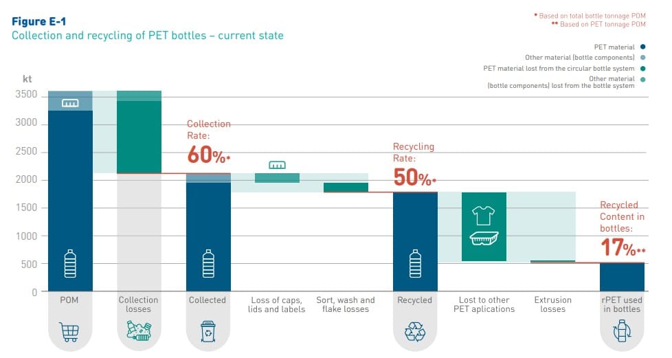 Tuttavia la situazione che emerge dal rapporto non è esaltante, in quanto la maggior parte del polietilene tereftalato recuperato dalle bottiglie in Europa non ritorna sotto forma di materia prima seconda, o rPET, nella produzione di nuove bottiglie in PET.