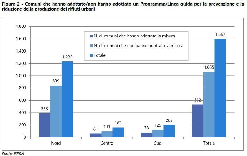 Al di là di singole iniziative spot, che vedremo di seguito, la riduzione dei rifiuti, come ogni altra azione complessa, richiederebbe una programmazione, una pianificazione. Purtroppo, in questo caso, la pianificazione non c’è. Infatti solo 532 Comuni (circa il 33% di quelli che hanno partecipato al sondaggio) ha affermato di aver “adottato un Programma/Linea guida per la prevenzione e la riduzione della produzione dei rifiuti urbani.