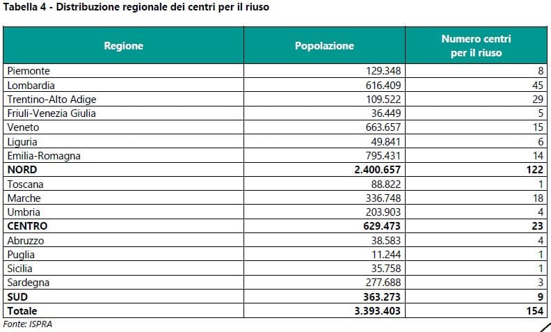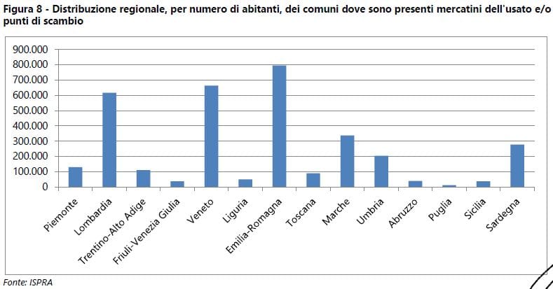 Al riutilizzo sono dedicate diverse domande del questionario. Ne risulta che, tra le misure per il riutilizzo dei beni, quella maggiormente adottata dai Comuni è l’istituzione di mercatini dell’usato e punti di scambio. Si tratta comunque di soli 272 Comuni sul totale degli oltre 1600 che hanno risposto al questionario (circa il 17% di chi ha compilato). L’altra azione più diffusa è la creazione di centri di riparazione (191 comuni, con una popolazione di quasi 5,4 milioni di abitanti), poi la presenza di centri per il riuso (155 Comuni con quasi 4,4 milioni di abitanti). In 145 Comuni è presente un centro di raccolta di beni da destinare al riutilizzo tramite operatori professionali dell’usato; in 53 Comuni sono presenti centri per lo scambio tra privati.