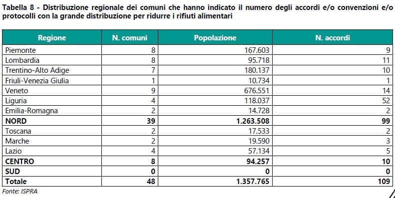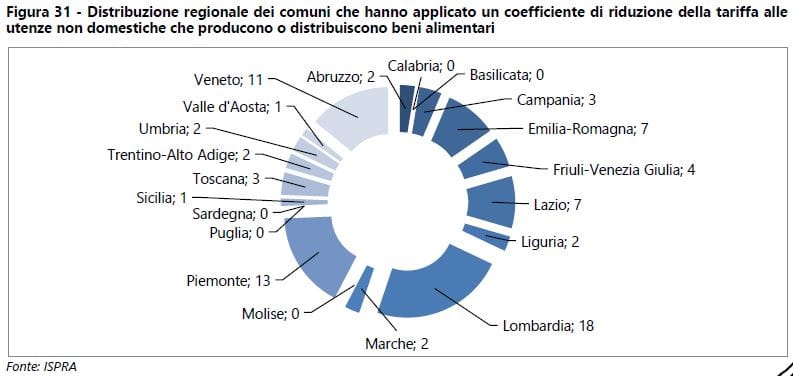 Una parte del questionario ISPRA è stata ovviamente dedicata al flusso più importante dei rifiuti urbani, quello dei rifiuti alimentari. La misura più adottata per l’umido è stata l’applicazione di un coefficiente di riduzione della tariffa alle utenze non domestiche “che producono o distribuiscono beni alimentari e che, a titolo gratuito, cedono tali beni agli indigenti e alle persone in maggiori condizioni di bisogno ovvero per l’alimentazione animale”. Tra le altre misure seguono poi gli accordi con i supermercati per distribuire i prodotti che altrimenti finirebbero in discarica. Anche se si tratta delle misure più diffuse, ad adottarle è stata una piccolissima parte dei Comuni: 78 nel primo caso (meno del 5% dei rispondenti), per circa 8 milioni di abitanti; 76 nel secondo. 45 amministrazione, inoltre, hanno riscontrato difficoltà che hanno impedito l’attuazione di campagne contro lo spreco alimentare: dalle quantità estremamente ridotte di cibo, “che non sostengono i costi di un tale servizio”, all’assenza di soggetti che possano curare la redistribuzione (come Caritas o associazioni), alla complessità delle normative fino ai problemi legati alla gestione della pandemia.