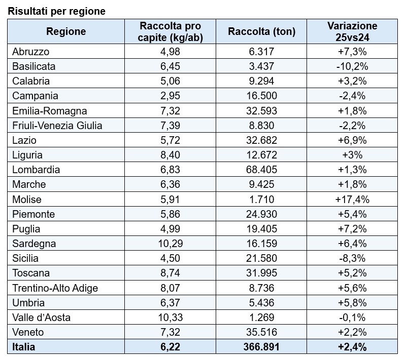 Sul piano territoriale, accanto a regioni che da anni registrano risultati più elevati come Valle d’Aosta (10,33 kg/ab) e Sardegna (10,29 kg/ab), seguite da Toscana (8,74 kg/ab) e Liguria (8,40 kg/ab), restano aree in cui la raccolta non raggiunge o, al massimo, supera di poco i 5 kg per abitante. Emblematico poi il caso della Campania, che si ferma a 2,95 kg/ab.