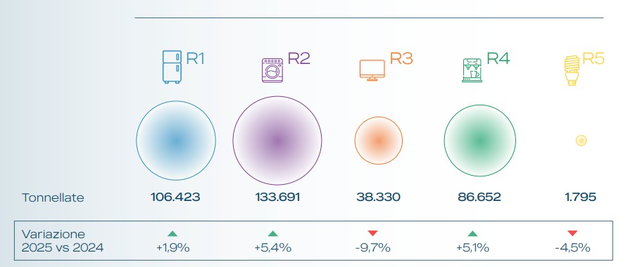 Sfogliando il rapporto si osserva che a trainare l’incremento sono soprattutto i grandi bianchi (raggruppamento R2) e i piccoli elettrodomestici ed elettronica di consumo (R4), che crescono rispettivamente del 5,4% e del 5,1%. Il raggruppamento freddo e clima (R1) vede un aumento dell’1,9%, mentre cala del 4,5% la raccolta delle sorgenti luminose (R5), e del 9,7% quella dei TV e monitor (R3).