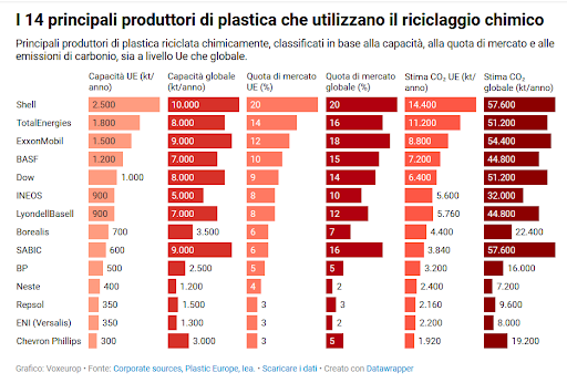 Negli ultimi anni, infatti, l’Unione Europea ha aperto al metodo del bilancio di massa, ha incluso il riciclaggio chimico nei meccanismi di conteggio degli obiettivi di riciclo e ha destinato oltre 760 milioni di euro di fondi pubblici a progetti di riciclaggio chimico. Gran parte dei finanziamenti è andata a impianti di pirolisi collegati direttamente alle principali compagnie petrolchimiche. Secondo le critiche riportate nell’inchiesta giornalistica internazionale, il sistema di calcolo delle “emissioni evitate” (basato sul confronto con l’incenerimento) permette di dichiarare riduzioni di CO₂ anche quando il processo genera emissioni elevate.