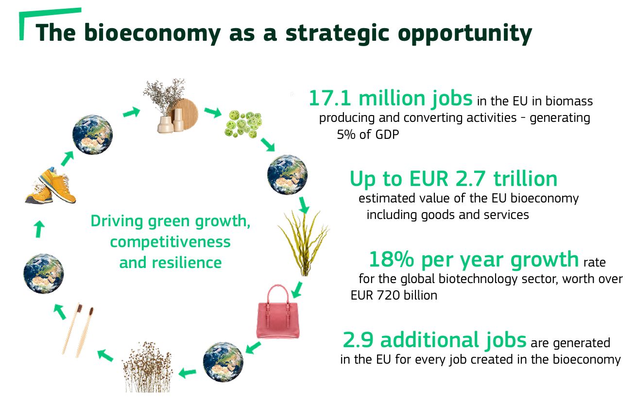 Nel presentare la Strategia per la bioeconomia la Commissione insiste sul fatto che si tratti di un driver di crescita verde, competitività e resilienza, nonché motore per garantire la sicurezza alimentare e nutrizionale, gestire le risorse naturali in modo più sostenibile, ridurre la dipendenza da risorse non rinnovabili, contribuire alla lotta al cambiamento climatico, rafforzare la competitività europea e creare posti di lavoro.