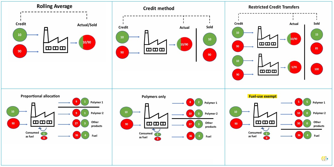 Col fuel-use exempt model le quantità di input da rifiuti plastici utilizzato come combustibile nel processo sono giustamente escluse, ma la quantità restante è liberamente ripartita tra i prodotti finali, al di là dagli input. Questo modello contabile che, come abbiamo raccontato, consente la più ampia riallocazione possibile tra i prodotti finali, al di là degli input effettivi, è problematico perché crea una netta distinzione tra ciò che accade nella realtà e ciò che può essere dichiarato.